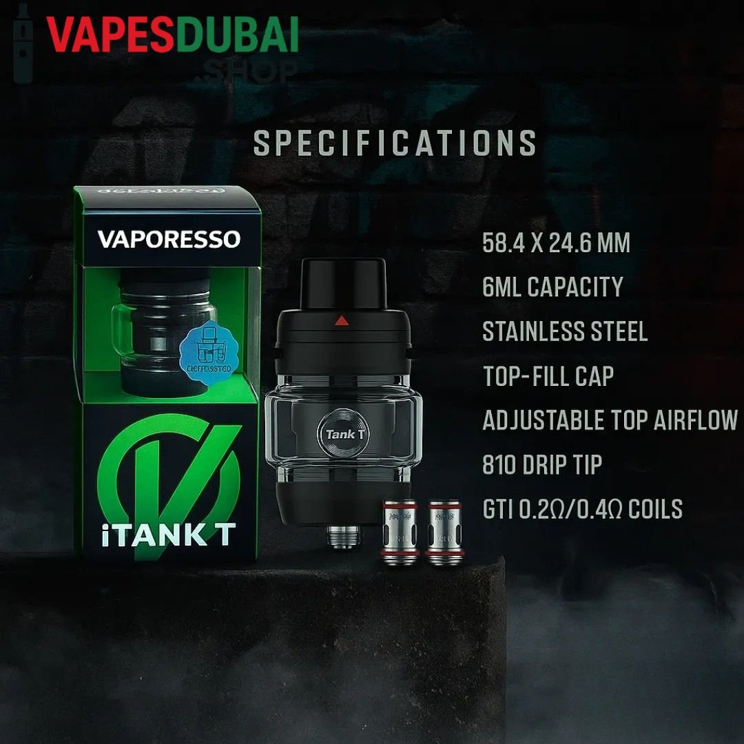 The Vaporesso iTank T 6ml is a versatile, high-performance tank that combines large e-liquid capacity, superior airflow, and compatibility with GTi Mesh Coils for an outstanding vaping experience. Its durable build and convenient top-fill system make it perfect for daily use, whether you prefer DL or RDL vaping styles. Fully compliant with UAE regulations and backed by Vapes Dubai Shop, it’s the ideal choice for vapers seeking reliability, flavor, and satisfaction.